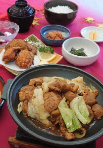 | お品書き | ・豚肉朴葉みそ ・手羽先の唐揚げ ・自家製キムチ ・小鉢 ・サラダ ・ごはん ・お漬物 ・おみそ汁・デザート |